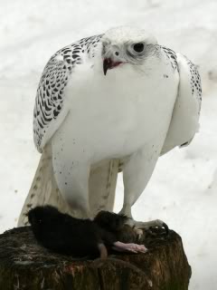Kräftig, ausdauernd, so verfolgt er seine Beute, die aus Schneehühnern und Schneehasen besteht. In der Falknerei wird er als Faustfalke (Jagdflug vom Handschuh) auf Fasane und Hasen eingesetzt. Obwohl das Klima des Polarkreises gewohnt, machen ihm unsere klimatischen Bedingungen keine Probleme.